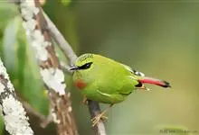 火尾绿鹛是莺科、绿鹛属小型鸟类,体长11-14厘米。上体绿色,头顶至枕具黑色鳞状斑,眼先和眼后黑色,眉纹黄绿色。两翅黑色具黄色和红色翅斑及白色端斑,极为醒目。中央一对尾羽绿色,外侧尾羽鲜红色。…全部>>