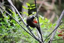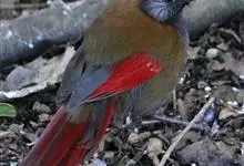 丽色噪鹛是红翅噪鹛的指名亚种。中型鸟类,体长23-28厘米。头顶灰橄榄褐色具粗著的黑色纵纹,头侧、颏、喉黑色,耳羽灰白色具黑色纵纹。背和胸、腹棕褐色,两翅具一大的鲜红色斑,尾亦为鲜红色。特征极明显,…全部>>