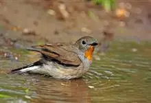 红喉姬鹟小型鸟类,体长11~13厘米。雄鸟上体灰黄褐色,眼先、眼周白色,尾上覆羽和中央尾羽黑褐色,外侧尾羽褐色,基部白色。颏、喉繁殖期间橙红色,胸淡灰色,其余下体白色,非繁殖期颏、喉变为白色。…全部>>