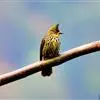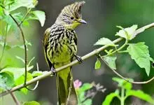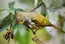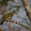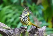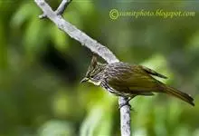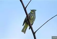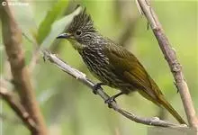 纵纹绿鹎,是鹎科鹎属的一种动物,是体型中等大小鸟类,体长20-24厘米。头绿褐色具明显的冠羽,其上具细的白色纵纹。上体橄榄绿色具细的白色纵纹。眼圈浅黄色。喉和尾和覆羽黄色,其余下体暗灰黑色具黄白色纵纹。…全部>>