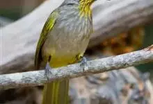 纹喉鹎:体长19厘米,是一种中等体型的偏绿色鹎。特征为头顶、脸颊、颏及喉均具黄色条纹。上体橄榄绿色。胸腹暗灰色,肛周和尾下覆羽艳黄。不可能与任何其他鹎类混淆。虹膜褐色;嘴黑色;脚粉褐色。…全部>>