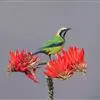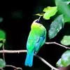蓝翅叶鹎:小型鸟类,体长15-18厘米。雄鸟通体草绿色,尾蓝绿色,肩和翅亮蓝 色,胸缀有黄色,颏、喉黑色。雌鸟颏,喉蓝绿色。栖息在海拔1500米以下的常绿阔叶林、次生林和林缘疏林灌丛中。…全部>>