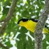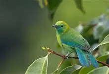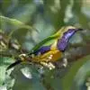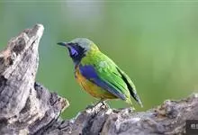 蓝翅叶鹎:小型鸟类,体长15-18厘米。雄鸟通体草绿色,尾蓝绿色,肩和翅亮蓝 色,胸缀有黄色,颏、喉黑色。雌鸟颏,喉蓝绿色。栖息在海拔1500米以下的常绿阔叶林、次生林和林缘疏林灌丛中。…全部>>