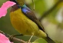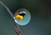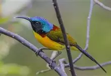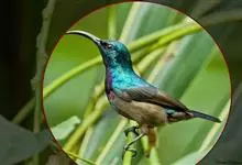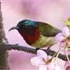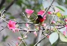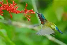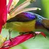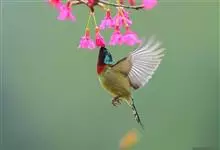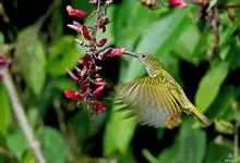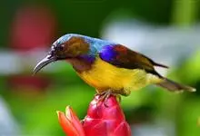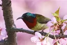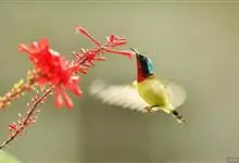 绿喉太阳鸟:共有9个亚种。小型鸟类,雄鸟体长13-15厘米、雌鸟10-12厘米。雄鸟前额至后颈、颏和喉辉绿色,头侧黑色,颈侧和背暗红色,两肩、下背橄榄绿色,腰鲜黄色,尾上覆羽和中央尾羽暗绿色,…全部>>