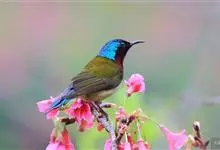 叉尾太阳鸟,雀形目太阳鸟科太阳鸟属留鸟;为小型鸟类,雄鸟头顶辉蓝绿色,上体橄榄绿色,腰明黄色,中央尾羽亮翠蓝色,羽轴针状延长,外侧尾羽黑色具白色端斑,头侧黑色,颜、喉和胸为绛红色,…全部>>