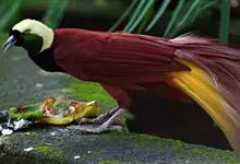 大极乐鸟是极乐鸟属中最大的鸟种。成年雄鸟体长可达到43厘米,雌性可达35厘米。雄鸟的额、颊、喉等墨绿色;头、颈黄色;上体暗赤栗色;腹部葡萄红色,胁部有长饰羽,其基部橙黄,中部黄色,…全部>>