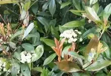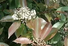 石楠 Kalkman),是蔷薇科石楠属的常绿乔木,高5~12米,株型紧凑,树冠圆球形。树枝为褐灰色;鳞片为褐色,没有毛;叶片革质,长椭圆至侧卵状椭圆形,有锯齿,新叶红色光亮。复伞房花序,白色小花,…全部>>