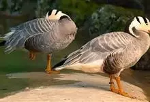灰雁:体长70-90厘米,翼展147-182厘米,体重2.5-4千克,寿命17年。体大而肥胖。嘴、脚肉色,上体灰褐色,下体污白色,飞行时双翼拍打用力,振翅频率高。脖子较长。腿位于身体的中心支点,…全部>>
