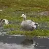 斑头雁是雁形目鸭科雁属鸟类,又称白头雁、黑纹头雁。通体大都灰褐色,头和颈侧白色,头顶有两道黑色带斑;虹膜暗棕色,嘴橙黄色,嘴甲黑色,脚和趾橙黄色;背部淡灰褐色,羽端缀有棕色,形成鳞状斑;颏、喉污白色,…全部>>