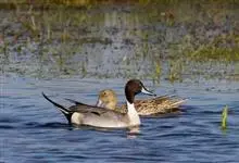 针尾鸭,是雁形目鸭科鸭属动物。体长约75厘米的大型戏水鸭,雄鸟头暗褐色,颈侧有白色纹路,向下与胸部白色相连,中央一对尾羽特别长;背灰色,有黑色细纹;翼镜绿色,胸腹白色,尾下覆羽黑色;雌鸟体羽大致为褐色,…全部>>