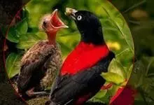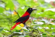 朱鹂:中等鸟类,体长23-28厘米。雄鸟绛紫红色,头、上胸及翼黑色。雌鸟上背及背部深灰色,尾覆羽及尾绛紫红色,腹部及下胸白而密布黑色纵纹。与鹊色鹂幼鸟的区别在上背灰色较深,下体白色较少且纵纹较粗。…全部>>
