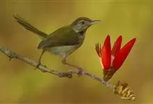 普通缝叶莺,是雀形目鹅科莺亚科缝叶莺属一种。体长10-14厘米,体重7-10克,雄鸟前额棕红,头顶至枕棕橄榄褐,上体橄榄绿染黄,飞羽及尾羽暗褐;繁殖期雄鸟的中央尾羽特形延长,下体淡皮黄白色。…全部>>