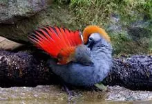 赤尾噪鹛中型鸟类,体长24~28厘米。头顶至后颈红棕色,两翅和尾鲜红色,眼先、眉纹、颊、颏和喉黑色,眼后有一灰色块斑。其余上下体羽大都暗灰或橄榄灰色。特征极明显,特别是通过鲜红色的头顶、翅和尾。…全部>>