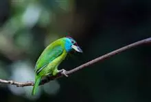 绿拟啄木鸟为鴷形目,须科,拟啄木属的一种。形较大拟啄木鸟略小,体长约260mm。头、颈及胸浅褐而具淡黄白色条纹;喉几为淡黄白色;身体余部草绿色。虹膜棕褐色,眼周裸露部黄色;嘴峰角黄色;跗跖和趾角黄…全部>>