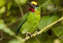 金喉拟啄木鸟,是须鴷科、拟啄木鸟属的鸟类。金喉拟啄木鸟为小型鸟类,体长19-24厘米。额深红色,头顶金黄色,后枕具一大块深红色斑,耳羽和头侧银灰色,上体草绿色,颏和上喉金黄色,下喉淡银灰色,…全部>>