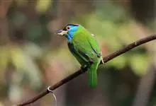 蓝喉拟啄木鸟,是须鴷科、拟啄木鸟属的鸟类。蓝喉拟啄木鸟为小型鸟类,体长20-23厘米。前额至头顶鲜红色,其上有一宽阔的黑色横带,将此红色分为前后二块;头侧、颏、喉蓝色,下喉两侧各具一红色点斑。…全部>>