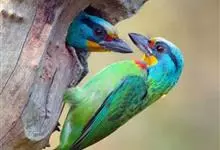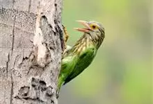 绿拟啄木鸟为鴷形目,须科,拟啄木属的一种。形较大拟啄木鸟略小,体长约260mm。头、颈及胸浅褐而具淡黄白色条纹;喉几为淡黄白色;身体余部草绿色。虹膜棕褐色,眼周裸露部黄色;嘴峰角黄色;跗跖和趾角黄…全部>>