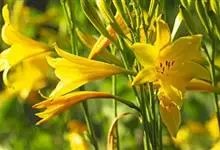 黄花菜 别名金针菜、柠檬萱草等,是阿福花科萱草属的多年生宿根性草本植物。根近肉质,中下部常有纺锤状膨大;叶7~20枚,长50~130cm,宽6~25mm;花葶长短不一,花梗较短,花多朵,…全部>>