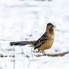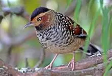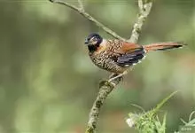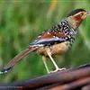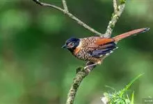 大噪鹛:中型鸟类,体长32-36厘米。额至头顶黑褐色,背栗褐色满杂以白色斑点,斑点前缘或四周还围有黑色。初级覆羽、大覆羽和初级飞羽具白色端斑。尾特长,均具黑色亚端斑和白色端斑。颏、喉棕褐色,…全部>>