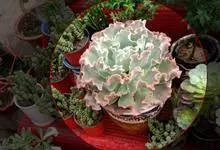 女王花笠,又名扇贝石莲花、女王花舞笠,是景天科拟石莲花属的多肉植物。由美国加利福尼亚州的育种师Dick Wright于1964年培育。特征是呈大波浪状褶皱的红色叶缘和气质高贵的粉紫色调。…全部>>