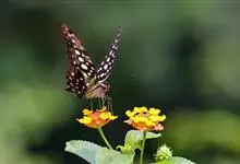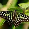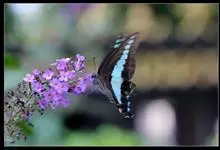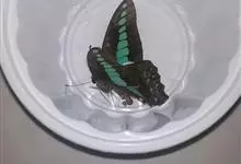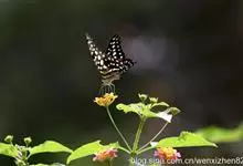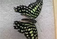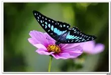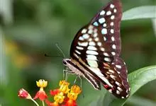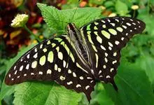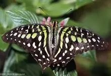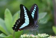 青带凤蝶Graphium sarpedon ,又名青凤蝶,是最普遍的中型凤蝶,飞行速度很快。青带凤蝶的翅膀中央有许多浅蓝色的斑点,很整齐地排列成一条直线。这些斑点由上而下逐渐变大,就像一条青色的带子。全部>>