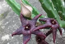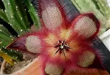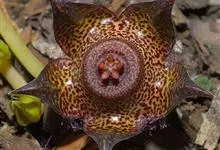 巨花犀角又称大豹皮花,是夹竹桃科犀角属的一种植物。茎粗,花大,边缘生长细毛。植株柱形多分枝呈丛生,柱形具4棱,棱缘具细小疣突。花大,五角星形黄色,并有横向棕褐色斑纹,似豹皮而得名。花期夏秋两季。…全部>>
