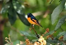 灰喉山椒鸟:共有8个亚种。体长18-22厘米。雄鸟头部和背亮黑色,腰、尾上覆羽和下体朱红色,翅黑色具一大一小的两道朱红色翼斑。中央尾羽黑色,外侧尾羽基部黑色,端部红色。…全部>>