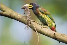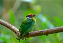 金喉拟啄木鸟,是须鴷科、拟啄木鸟属的鸟类。金喉拟啄木鸟为小型鸟类,体长19-24厘米。额深红色,头顶金黄色,后枕具一大块深红色斑,耳羽和头侧银灰色,上体草绿色,颏和上喉金黄色,下喉淡银灰色,…全部>>