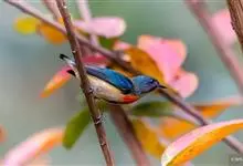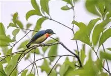 红胸啄花鸟:体重5-10克,体长60-92毫米。体形纤小。雄鸟上体呈辉亮的金属绿色;下体棕黄,胸部具一朱红色块斑,极易与其他啄花鸟区别。雌鸟上体呈橄榄绿,下体棕黄色。虹膜褐色,嘴褐黑色或角灰色,…全部>>