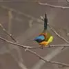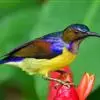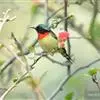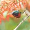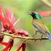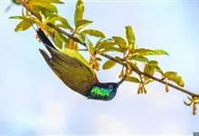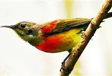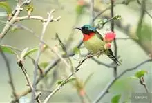 绿喉太阳鸟:共有9个亚种。小型鸟类,雄鸟体长13-15厘米、雌鸟10-12厘米。雄鸟前额至后颈、颏和喉辉绿色,头侧黑色,颈侧和背暗红色,两肩、下背橄榄绿色,腰鲜黄色,尾上覆羽和中央尾羽暗绿色,…全部>>