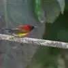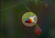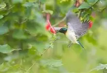 叉尾太阳鸟,雀形目太阳鸟科太阳鸟属留鸟;为小型鸟类,雄鸟头顶辉蓝绿色,上体橄榄绿色,腰明黄色,中央尾羽亮翠蓝色,羽轴针状延长,外侧尾羽黑色具白色端斑,头侧黑色,颜、喉和胸为绛红色,…全部>>