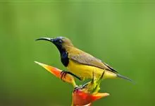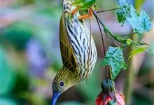 纹背捕蛛鸟:为太阳鸟科捕蛛鸟属的鸟类。是太阳鸟科中体型较大的一种,体重25-45克,体长160-210毫米。嘴粗长而尖且向下弯曲。上体橄榄黄色具黑色中央斑纹。下体淡黄白色满布黑色纵纹,尾具黑色次端斑。…全部>>