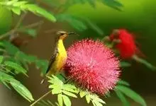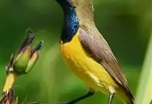 黄腹花蜜鸟是雀形目太阳鸟科花蜜鸟属鸟类。体型较小、喙略短而弯、腹部黄色。雄鸟繁殖季节颏及胸黑紫色并泛金属光泽,具有绯红色及灰色胸带,将上腹部黑色斑与前胸隔开,肩斑为橙黄色丝质羽,上体橄榄绿色,…全部>>