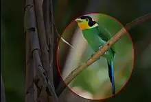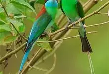 蓝喉蜂是蜂虎科蜂虎属鸟类。体长26-28厘米,嘴长而弯曲,有明显细长的中央尾羽。头部、颈部和背部为巧克力色,有黑色眼纹。喉部、腰部和尾羽为蓝色。腹部和两翼为绿色。幼鸟外观似成鸟,头部、颈部和背部为绿色,…全部>>