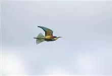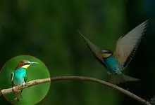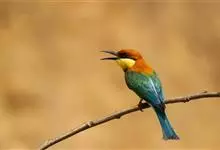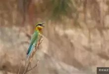 栗喉蜂虎是蜂虎科蜂虎属的鸟类。有热带鸟类羽毛艳丽的特征:喉部是栗红色的,黑色的过眼纹,翅膀和背部是绿色的,尾翼是蓝色的,飞行时翅膀下面的羽毛是橙黄色的,在阳光的照射下,它们全身闪烁着金属般的艳丽光泽,…全部>>