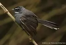 白眉扇尾鹟:体长17厘米,是一种中等体型的灰色扇尾鹟。色彩独特。宽宽的眉纹及前额白色,尾有白色宽边。髭纹白色,与黑色的脸及喉成对比;尾呈扇形,4对中央尾羽黑褐色,邻近两对具宽的白色端斑,最外侧两对白…全部>>