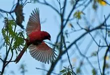 血雀雀科朱雀属鸟类,体重36-49克;体长155-182毫米。雄鸟除眼先、翼与尾为黑色外,通体为鲜红色;嘴鲜黄;雌鸟暗橄榄绿色,羽端较淡或带黄色;腰鲜黄;嘴较暗。虹膜褐色;嘴黄色;腿和脚褐色。…全部>>