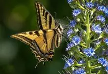 金凤蝶,是鳞翅目凤蝶科凤蝶属动物。金凤蝶为中型凤蝶,翅展70-84毫米,翅背面底色黑褐色,翅脉黑色,翅室具黄斑;前翅背面基部呈暗黄色,亚外缘为黑色,内具一列小黄斑;后翅背面亚外缘区具黑宽边,…全部>>