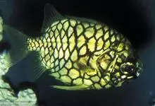 松球鱼为暖水性底层海鱼,因体被大栉鳞、形似松果球而得名。在它头部的发光器官中与其共生着费氏弧菌。当细菌的浓度达到一定程度,便开始发光,便于在黑暗的海洋中寻找并捕食猎物。松球鱼又叫凤梨鱼,是金眼鲷目中…全部>>