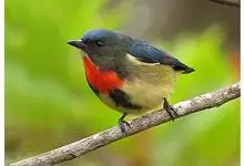 红胸啄花鸟:体重5-10克,体长60-92毫米。体形纤小。雄鸟上体呈辉亮的金属绿色;下体棕黄,胸部具一朱红色块斑,极易与其他啄花鸟区别。雌鸟上体呈橄榄绿,下体棕黄色。虹膜褐色,嘴褐黑色或角灰色,…全部>>