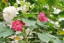 木芙蓉,锦葵科木槿属落叶灌木或小乔木。小枝上有细绒毛;叶片为卵状心形,托叶为披针形,常早落;花单生,花萼为钟形,花冠初为白色或淡红色,后逐渐变为深红色;果实为扁球形,有淡黄色的毛附着。花期8到10月。…全部>>