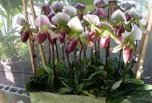 兜兰又称拖鞋兰。兰科多年生草本。多数为地生种,杂交品种较多。是栽培最普及的洋兰之一。主要分布亚洲热带和亚热带林下。喜温暖、湿润和半阴的环境。茎甚短;叶片带形或长圆状披针形,绿色或带有红褐色斑纹。…全部>>