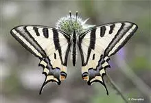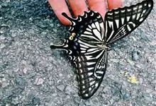 柑橘凤蝶是鳞翅目凤蝶科凤蝶属昆虫,又称柑橘黄凤蝶、花椒凤蝶、燕凤蝶。中型凤蝶。翅底色黑褐色,翅脉黑色,各翅室内具长短不一的黄白色斑;前翅中室具4条近乎平行的黄色线纹,后翅臀区具一枚橘红色的圆斑,…全部>>