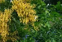 腊肠树:是豆科腊肠树属植物。落叶乔木,高可达15米;枝细长;树皮灰色,老时粗糙,暗褐色。叶长30-40厘米,小叶对生,薄革质,阔卵形,卵形或长圆形,边全缘,幼嫩时两面被微柔毛,老时无毛;叶脉纤细,…全部>>