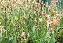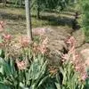 粉美人蕉:是一种球根草本植物。根茎延长,株高1.5-2米;茎绿色。叶片披针形;总状花序疏花,单生或分叉,稍高出叶上;苞片圆形,褐色,花黄色,无斑点;有多种园艺栽培品种,颜色从粉、橙红色及具带红色斑点…全部>>