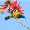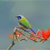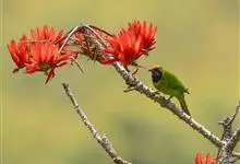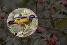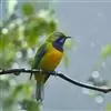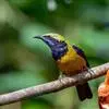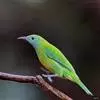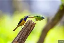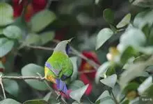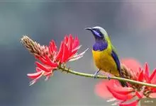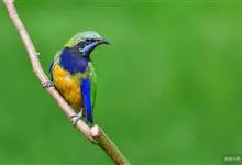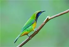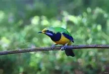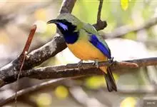 橙腹叶鹎体形大小和金额叶鹎相似,体长16~20厘米。额至后颈黄绿色,其余上体绿色,小覆羽亮钴蓝色,形成明显的肩斑。颏、喉、上胸黑色具钴蓝色髭纹,其余下体橙色。飞羽和尾羽雄鸟黑色、雌鸟绿色。…全部>>