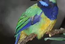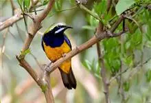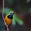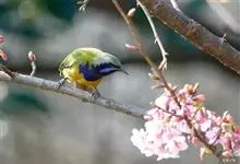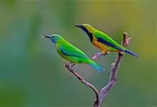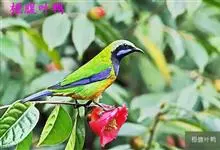 橙腹叶鹎体形大小和金额叶鹎相似,体长16~20厘米。额至后颈黄绿色,其余上体绿色,小覆羽亮钴蓝色,形成明显的肩斑。颏、喉、上胸黑色具钴蓝色髭纹,其余下体橙色。飞羽和尾羽雄鸟黑色、雌鸟绿色。…全部>>