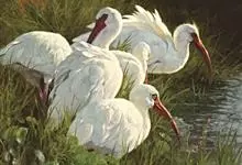 美洲白鹮:是一种大型涉禽。体长56-58厘米,体重750-1050克。头和颈裸出,喙很长,向下弯曲。飞行时颈和脚伸直,交替地拍动翅膀和滑翔。成年美洲白鹮,除了嘴和腿部是橘红色,翅膀末端有黑色外,…全部>>