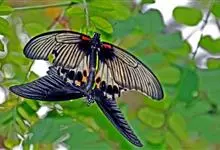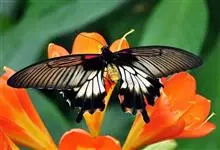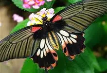 玉斑凤蝶Papilio helenus 别名白纹凤蝶,是凤蝶科凤蝶属美凤蝶亚属大型种类。雌雄同型;体翅皆黑色,后翅正面中室外有3个并列的白色斑,亚外缘有1列模糊的新月形红色斑,…全部>>