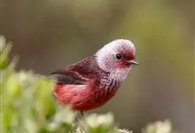 藏朱雀:全长约17-18厘米。雄鸟头部深红色具光辉,喉部暗红色具白色点斑;背部灰白色,各羽具玫瑰红色羽端,形成许多斑纹;腰部淡玫瑰红色;翅暗褐色,沾灰白,羽端沾玫瑰红或灰白色;尾暗棕色,端缘玫瑰红色…全部>>